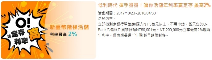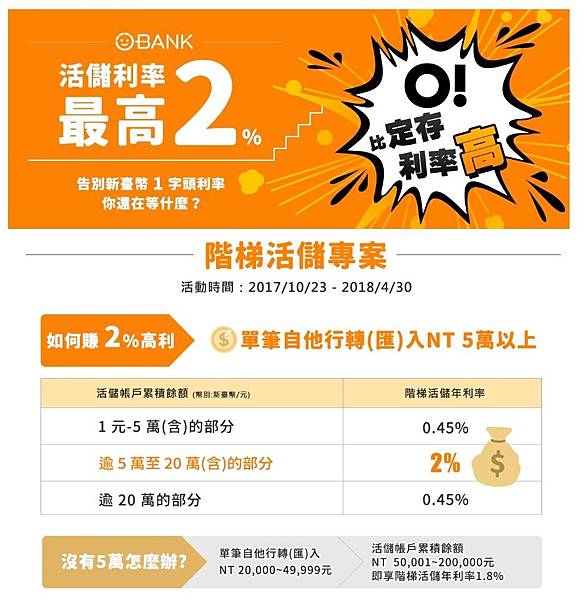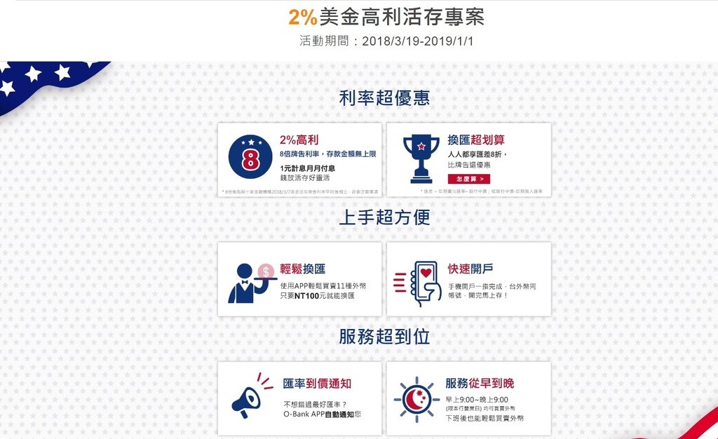**2018/3/19~2019/1/1美元也有2%高利活存了,不設階梯無金額上限,$1美元起息,NT$100就能換匯,線上換匯還享8折優惠。