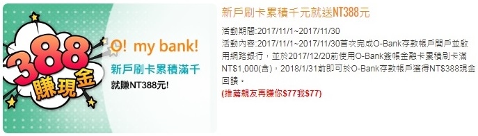 開戶後30日內啟用網銀並以簽帳卡累計消費77元以上。